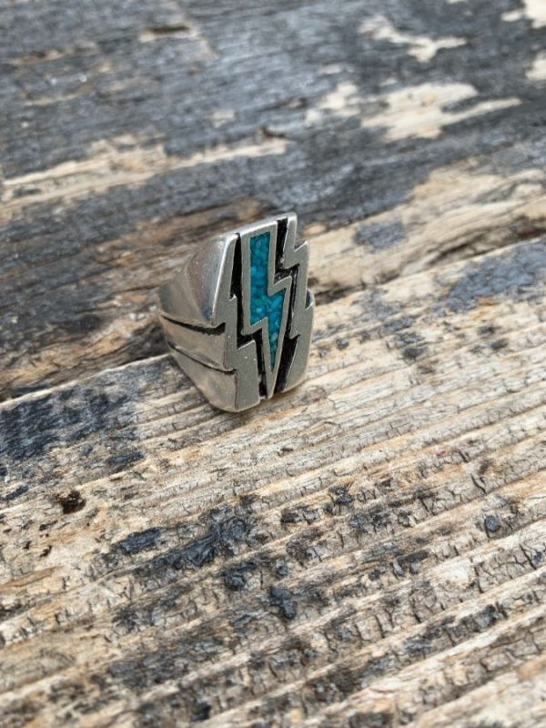 LIGHTNING BOLT WITH CRUSHED TURQUOISE INLAY MOTORCYCLE BIKER RING