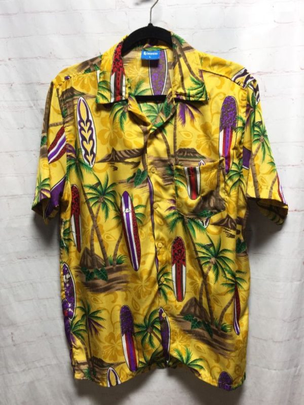 OnShore Hawaiian shirt, short sleeves, button-up, lightweight, Surfboards & Palm Trees print, yellow/green/blue/purple/white/black/brown/tan, size L As is