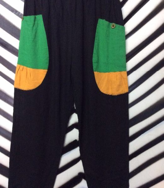 Beach pants, linen, color block design, black/yellow/green, size M