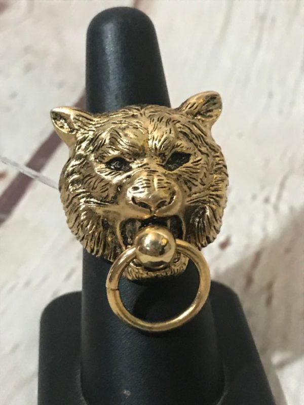 RING, LION HEAD WITH DOOR KNOCKER IN IT’S MOUTH, GOLD METAL, DEAD-STOCK, GOLD