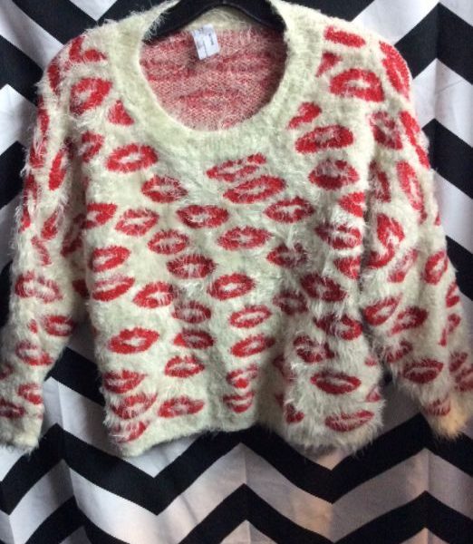 Sweater, pullover, fuzzy, lips design, creme/red as is