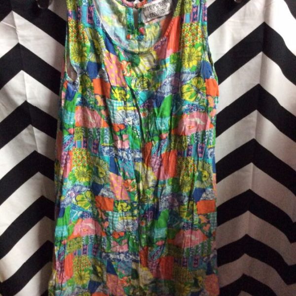 1960’S DRESS, SLEEVELESS, COTTON, SHIFT STYLE, MINI LENGTH, FLORAL & BIRD HAND PRINT, PINK/BLUE/GREEN/PURPLE