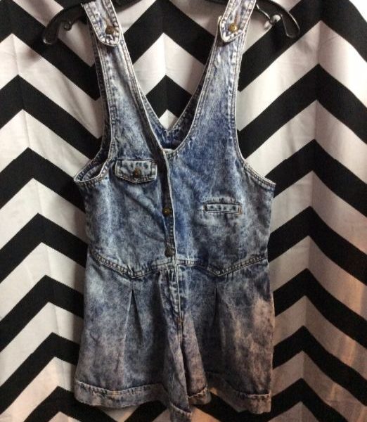 DENIM OVERALL/ROMPER – SHORTS – ZIP-UP – TIE IN BACK – ACID WASH
