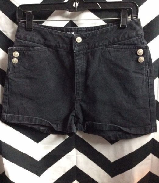 DENIM SHORTS, BUTTONS ON SIDE OF POCKETS, BLACK, SIZE 29W
