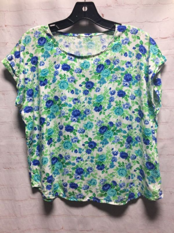 TOP, RAYON, PULLOVER, CAP SLEEVES, FLORAL PRINT DESIGN, WHITE/GREEN/DARK/BLUE/TEAL, SIZE S