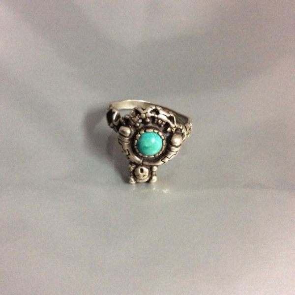 RING – ROUND TURQUOISE STONE – STERLING SILVER KACHINA DOLL SETTING – SIGNED