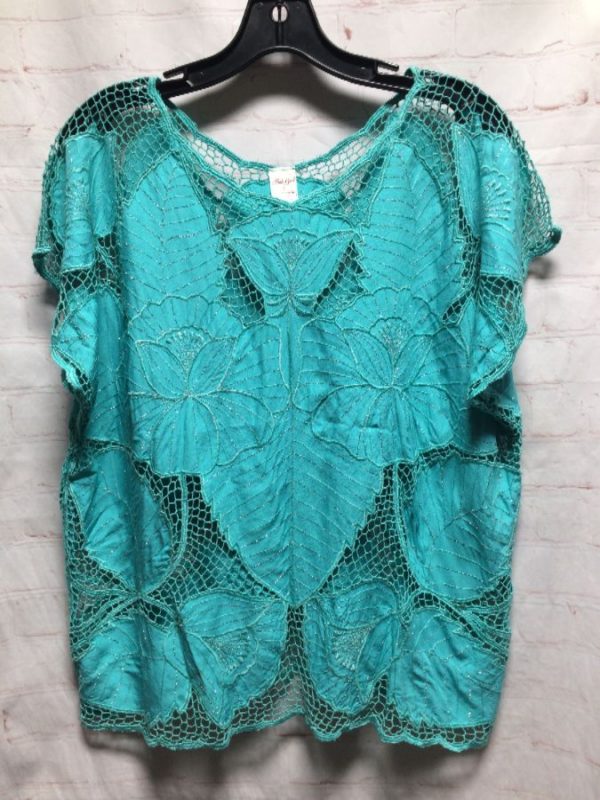 Bali Girl beach cover-up/top, rayon, pullover, short sleeves, large embroidered flower & leaf shapes surrounded by netting, hand made, turquoise, size L
