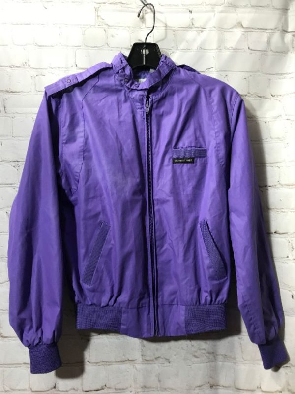 Members Only jacket, zip-up, belted strap on collar, shoulder epaulets, zip-up front left crest pocket, purple, size 14 small fit