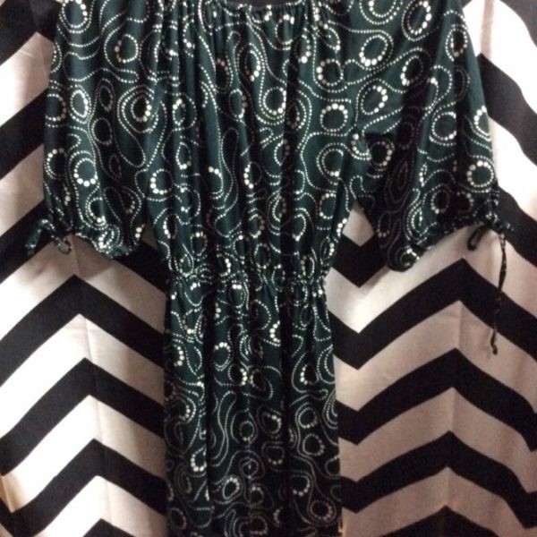 Dress, off shoulder, short sleeves, elastic waist, circle print design, dark-green/white