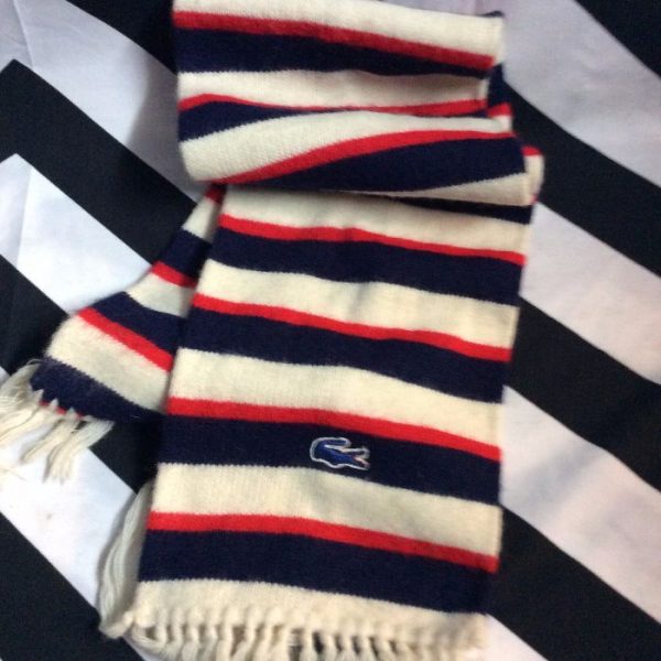 Retro Izod scarf, small horizontal striped design, red/white/black