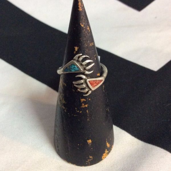 RING – STERLING SILVER – BEAR PAWS W/TURQUOISE & CORAL CHIPS