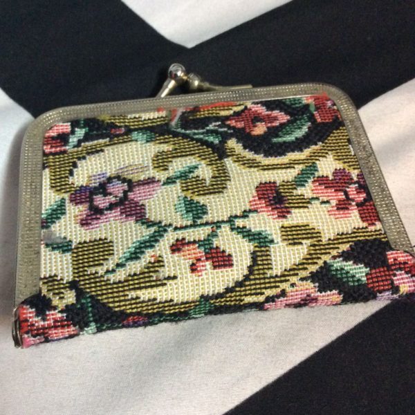 Travel sewing kit, floral tapestry design, snap closure, needle/thread/safety pins/tape measure/buttons/scissors, tan/creme/pink/green/black