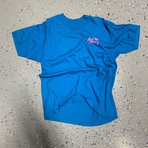 Local Motion T-shirt, screen printed small left front logo & large back logo with palm tree and Hawaii, dead-stock, blue/hot pink, size L
