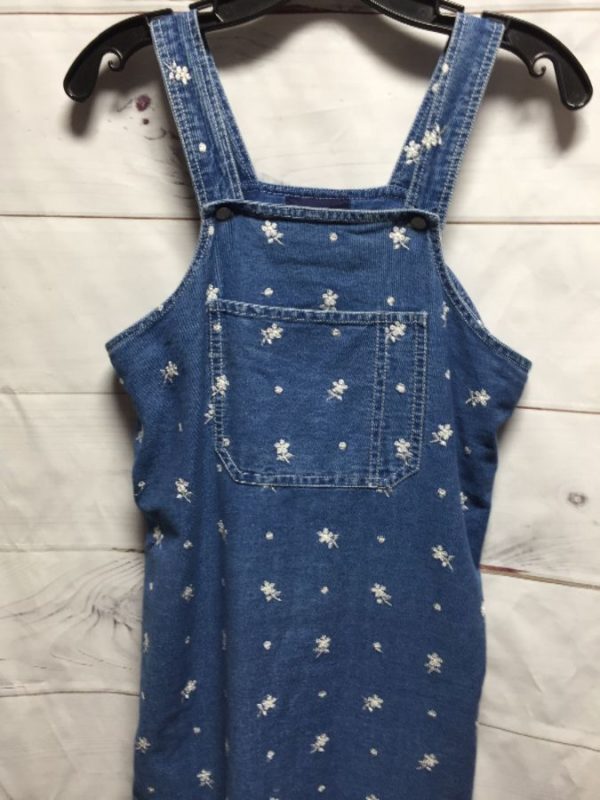 Solutions denim dress, cotton, button-up straps, long length, side slits, tiny embroidered flowers, front chest pouch pocket, blue/white, size P/S