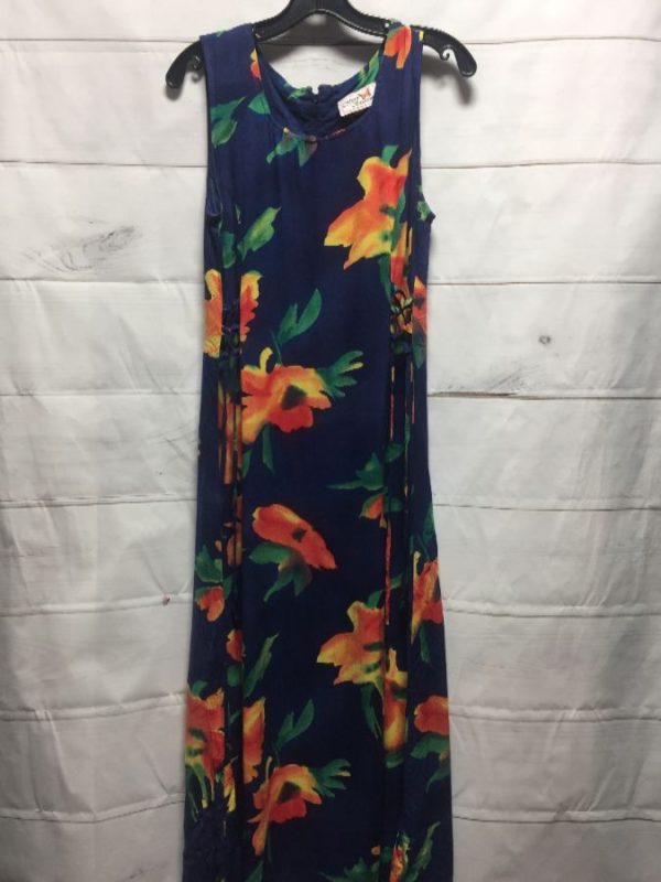 Four Seasons dress, sleeveless, zip-up in back, maxi length, tropical floral print, lace-up side detail, blue/yellow/orange/green, size M