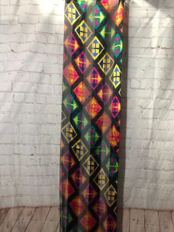 Head scarf, sheer, long, Aztec print design, black/pink/yellow