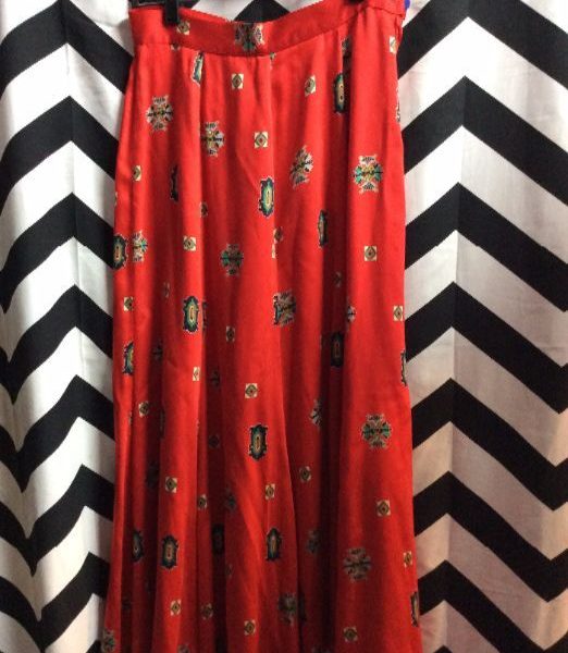 Skirt, long, silky, fitted waist, emblem design print, red/green, size 30W x 35L