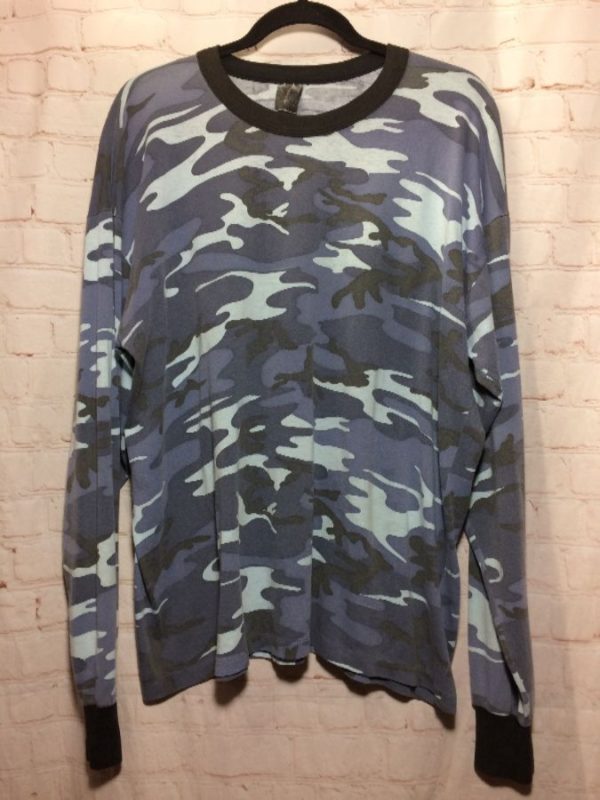 T-shirts, pullover, thermal material , long sleeves, ringer tee, paper thin, camo pattern, contrasting cuffs & collar, pale blue/black/gray blue/charcoal, size L