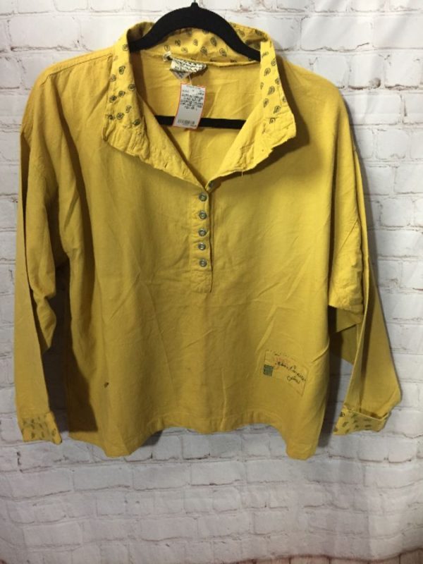 Cotton Express top, cotton, long Dolman sleeves, button-up neck, Paisley print collar & cuffs, mustard yellow, size L