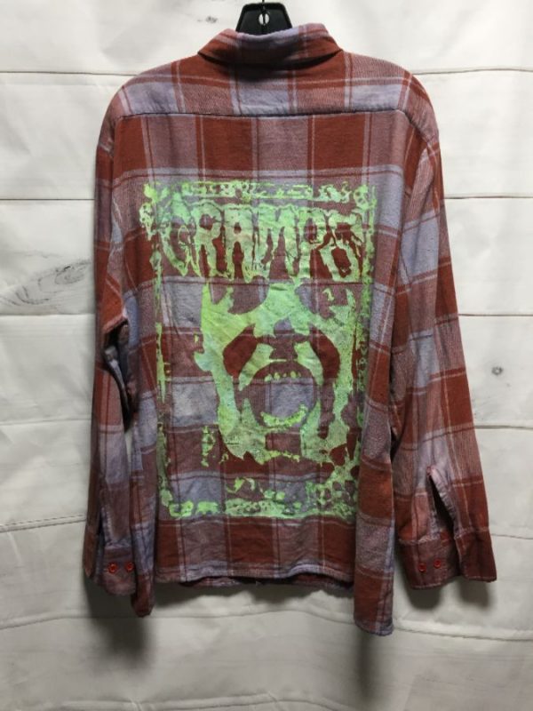 Northwest flannel shirt, long sleeves, button-up, The Cramp’s, screen printed back graphic, orange/pale blue/pale green, size XL As is