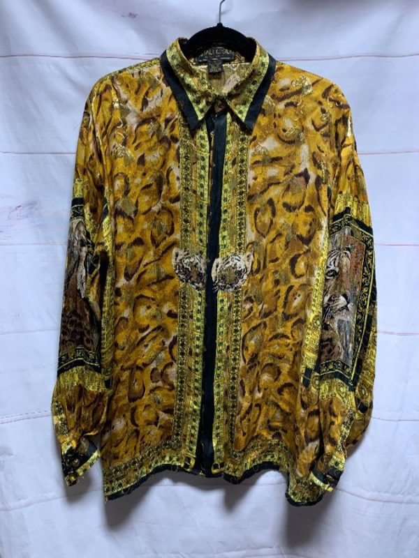 METALLIC SILK BY P.E.K. IMPORTS BLOUSE, SILK & METALLIC THREADS, LONG SLEEVES, BUTTON-UP, ORNATE BAROQUE DESIGNS, ANIMAL PRINT WITH LARGE TIGER FACES ON BACK & SLEEVES, GOLD/BLACK, SIZE M