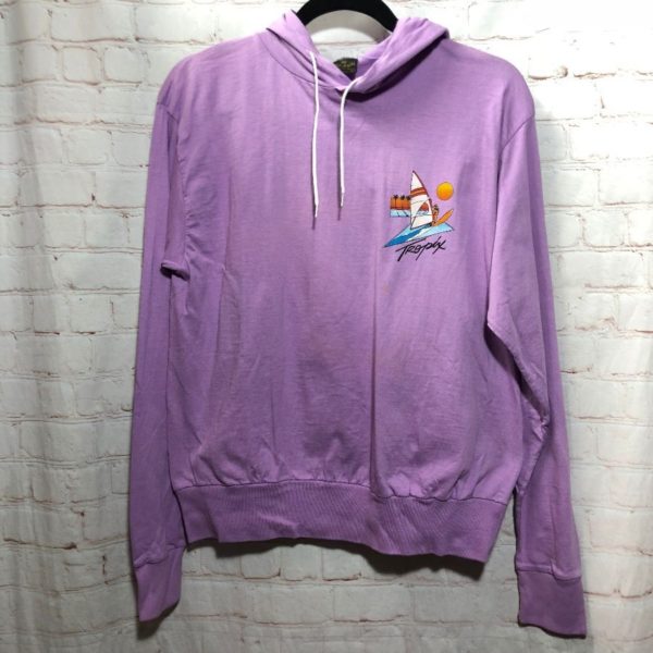Touch Of Gold T-shirt, cotton, long sleeves, hooded, screen printed Tropix & windsurfer graphic on left chest, purple/white/blue/orange, size L As is
