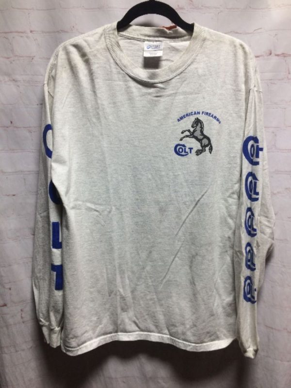 Port & Company T-shirt, pullover, long sleeves, Colt, American Firearms, screen printed small left chest design & large back design with lettering/logo/rearing horse, lettering down right arm, logo repeat down left arm, heather gray/navy blue/black, size L