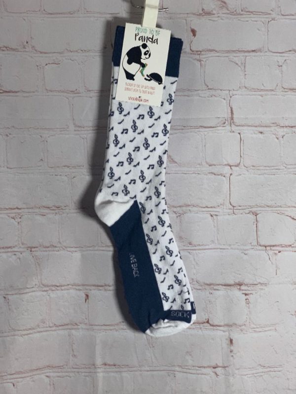 PROUD TO BE PANDA SOCKS, LONG LENGTH, MUSIC NOTE DESIGN, DARK SOLID COLOR BOTTOMS, LIGHT SOLID COLOR TOES & HEELS, SOCK PANDA DONATES SOCKS TO NEEDY, NWT, WHITE/NAVY BLUE
