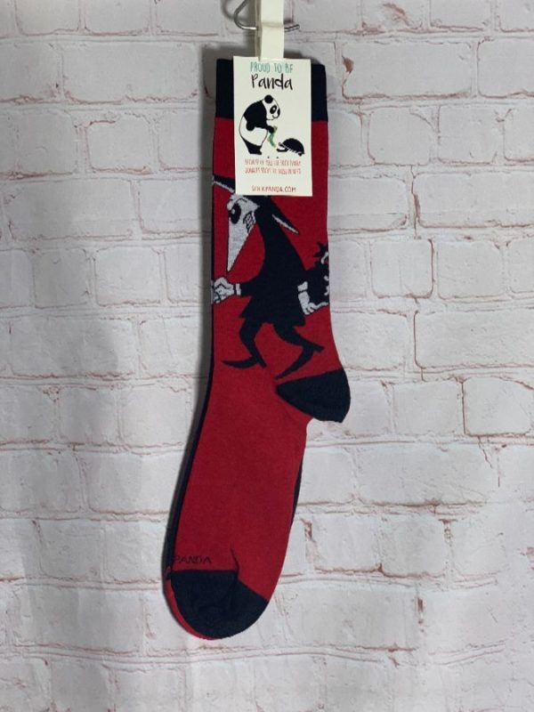 PROUD TO BE PANDA SOCKS, LONG SOCKS, MAD MAGAZINE’S SPY VS SPY DESIGN, SOLID COLORED TOES/HEELS/TOPS, RIGHT & LEFT SIDES HAVE REVERSE COLORS, NWT, SOCK PANDA DONATES SOCKS TO THE NEEDY, RED/BLACK/WHITE