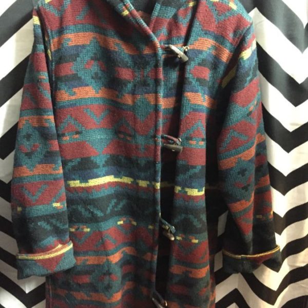 Woolrich jacket, wool knit, hooded, button-up with toggle buttons, long length, Aztec design, red/teal/orange, size M oversized fit