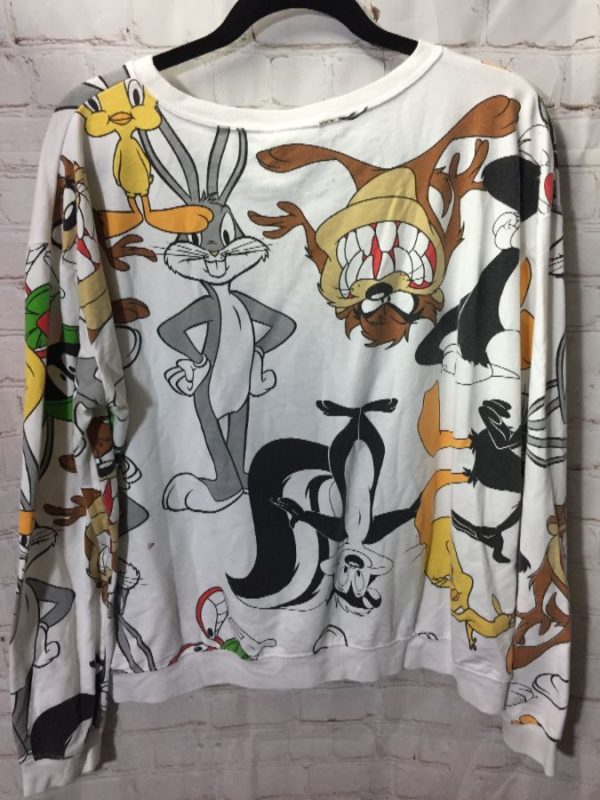DC Comics sweatshirt, pullover, long sleeves, allover Looney Toones cartoon character print, white/black/red/yellow/gray/multi, size XL