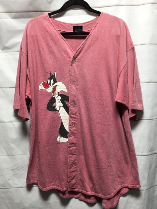 Classic Garment baseball jersey, cotton, short sleeves, button-up, Looney Tunes, Sylvester the cat graphic, screen printed graphic half shirt design on right side, red/white/black/pink, size L