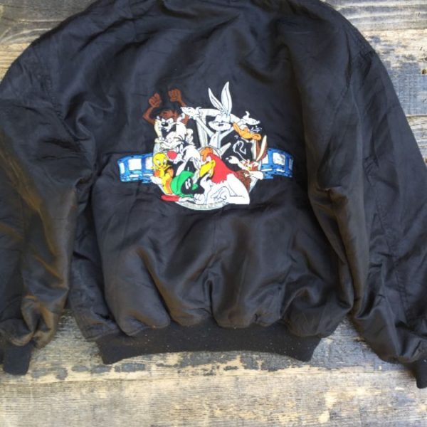 Warner Brothers bomber jacket, zip-up, quilted lining, Looney Tunes characters in screen printed full back design, black/orange/multi, size M