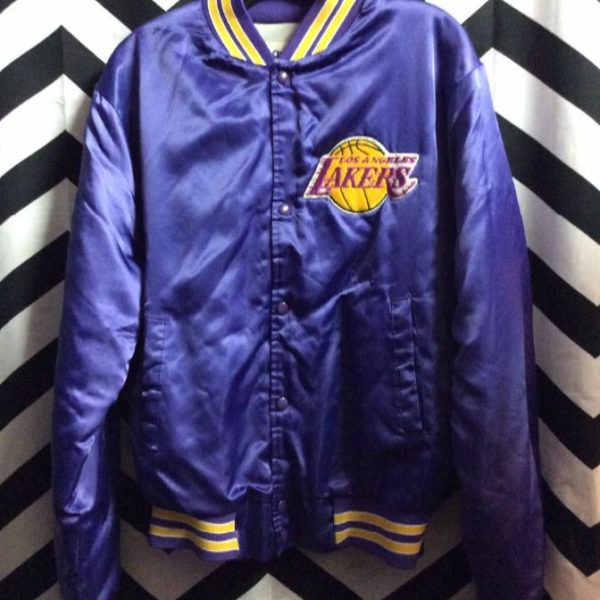 LOS ANGELES LAKERS CHALKLINE SATIN SPORTS JACKET W/LETTERS ON BACK AND TEAM LOGO FRONT LEFT CHEST