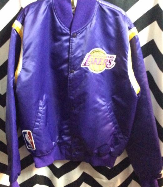 Los Angeles Lakers Starter satin baseball style jacket, button-up, team patches, purple/yellow, size L