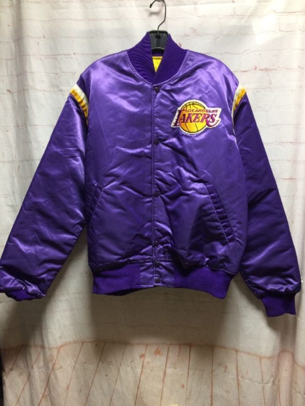 Starter sports jacket, satin, button-up with snaps, Los Angeles Lakers, striped sleeve trim, embroidered front logo patch, purple/yellow/white, size L