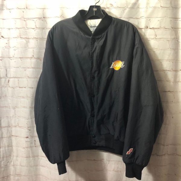 Swingster sports jacket, button-up, Los Angeles Lakers, embroidered left chest logo/sleeve design & lettering across back, black/yellow/purple/white, size L