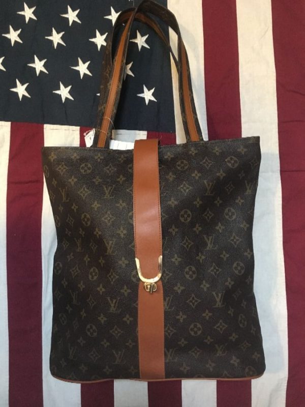 Louis Vuitton bag, long tote, Sac Plat style, monogram, toggle type clasp, chocolate/tan/olive green