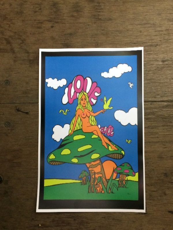 LOVE AND PEACE NAKED HIPPY GIRL ON MUSHROOM POSTER
