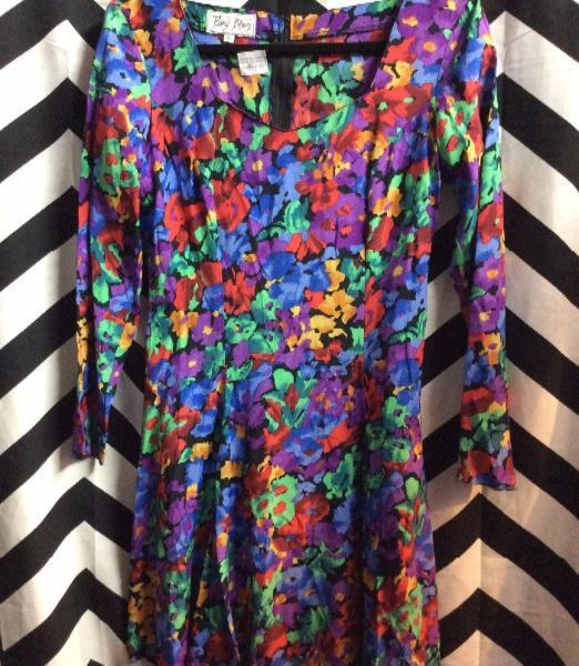 1990’s dress, mini style, long sleeves, floral print, blue/green/red/purple