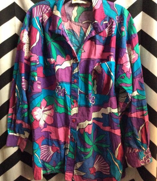 1990’s Hawaiian shirt, long sleeves, button-up, abstract floral/palm tree design, purple/green/teal/pink, size XL
