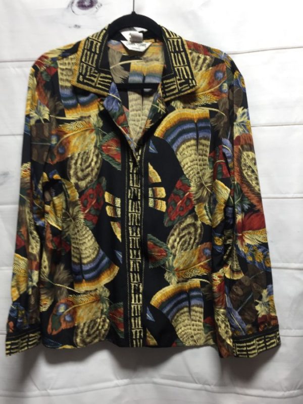 SHARON YOUNG SHIRT, POLYESTER, LONG SLEEVE, BUTTON-UP, FEATHER PRINT, BLACK/BEIGE/GOLD/RUST/GREEN, SIZE L AS IS