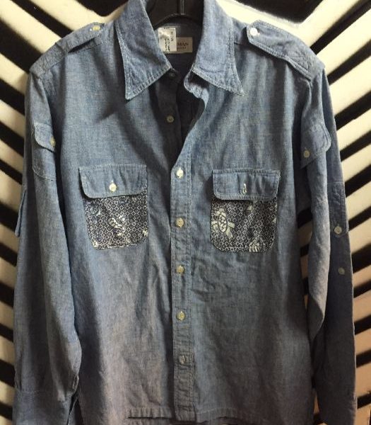 VINTAGE 1970S CHAMBRAY DENIM SHIRT W/PATCHWORK APPLIQUE
