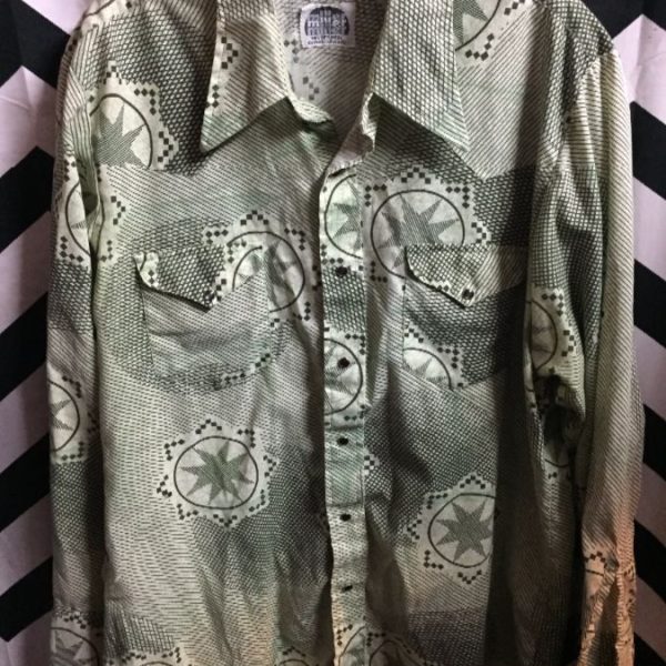 1970’s shirt, long sleeve, button-up, 2 front pockets, collar, funky star & geometric print, pale green/dark green, size 17-34
