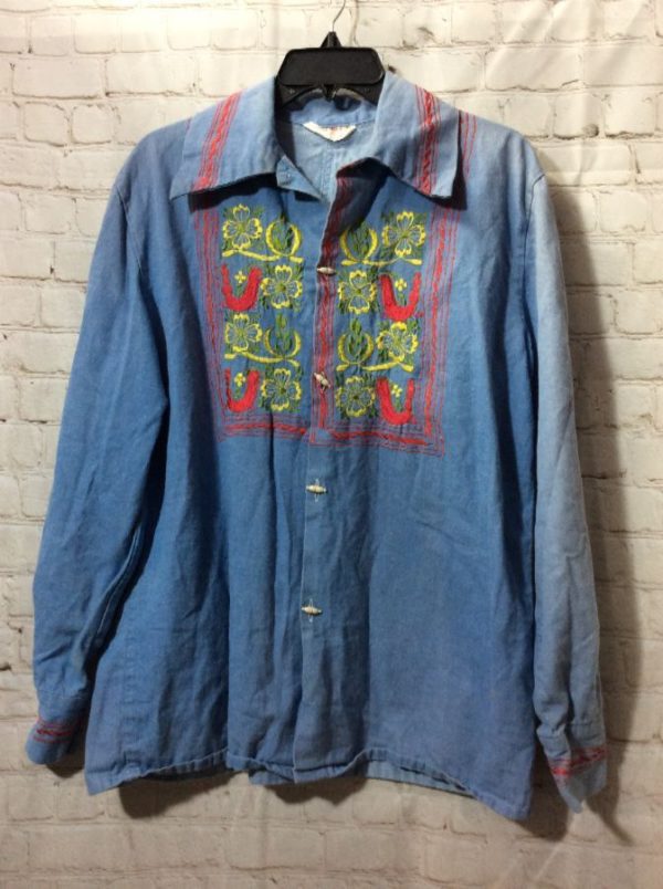1970’s shirt, cotton chambray, long sleeves, button-up, embroidered birds & flowers design, blue/red/yellow, size M