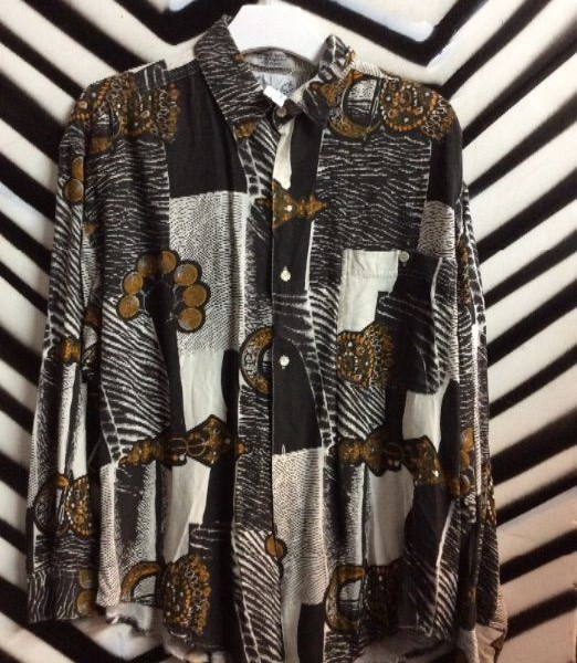 1990’s printed shirt, long sleeve button-up, bold print design, black/white/tan, size L