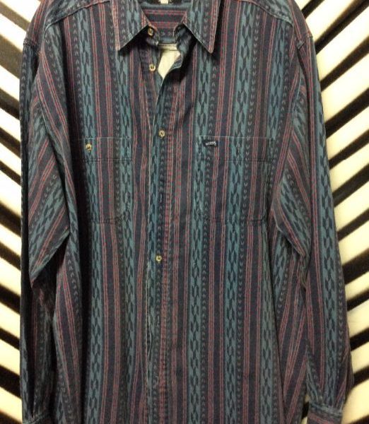 1990’s shirt, long sleeve button-up, Aztec striped design, blue, size L