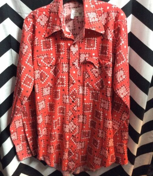 Western shirt, long sleeve, button-up pearl snaps, bandana print design, red/white, size 16-34