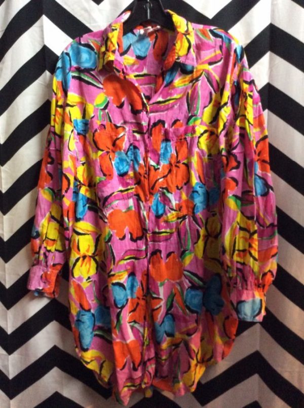 Shirt, long sleeve button-up, front pockets, bright floral pattern, pink/yellow/orange/blue, size M oversized