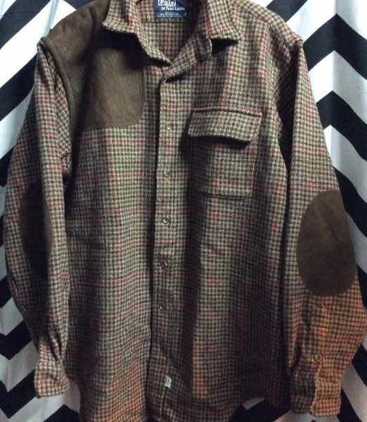 Polo by Ralph Lauren Houndstooth flannel hunting shirt, wool, long sleeve, button-up, leather patches, made in USA, brown/burgundy/gray, size L